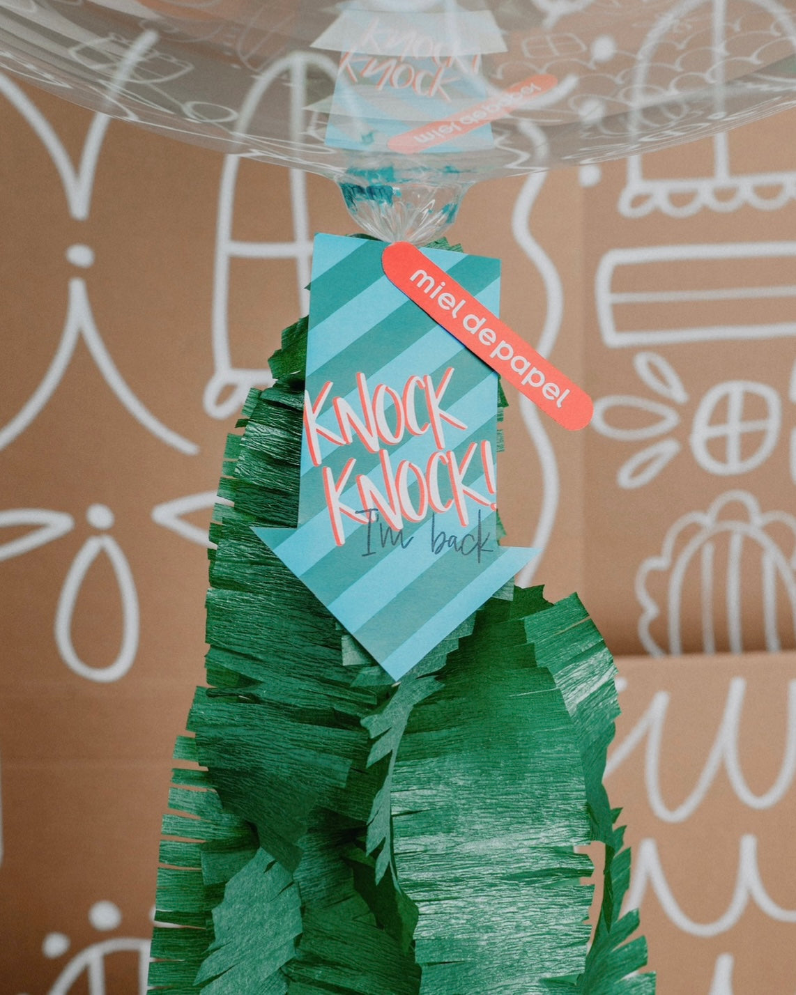 - Burbuja tematica de 24'' pintada con diseño con tematica navideña. Incluye un dibujo de regalo en color azul y tag tematico con el mensaje "SPECIAL DELIVERY FROM THE NORTH POLE TO:" donde se agregara el nombre indicado. Agregar el nombre en "INDICACIONES ESPECIALES". También incluye tassels decorativos. **La visualización final del producto entregado puede variar en la realidad respecto a esta imagen, ya que el arreglo de globos se elabora a mano.**