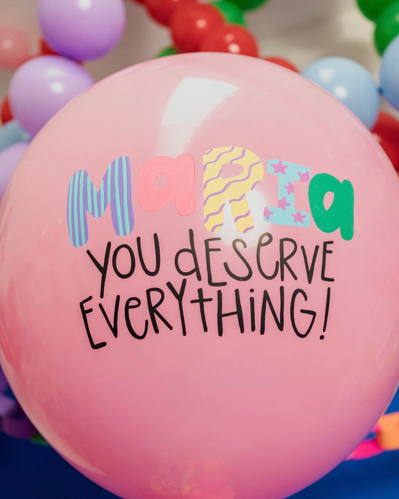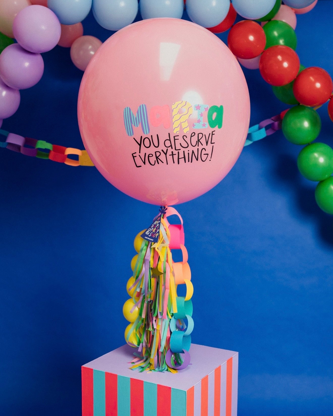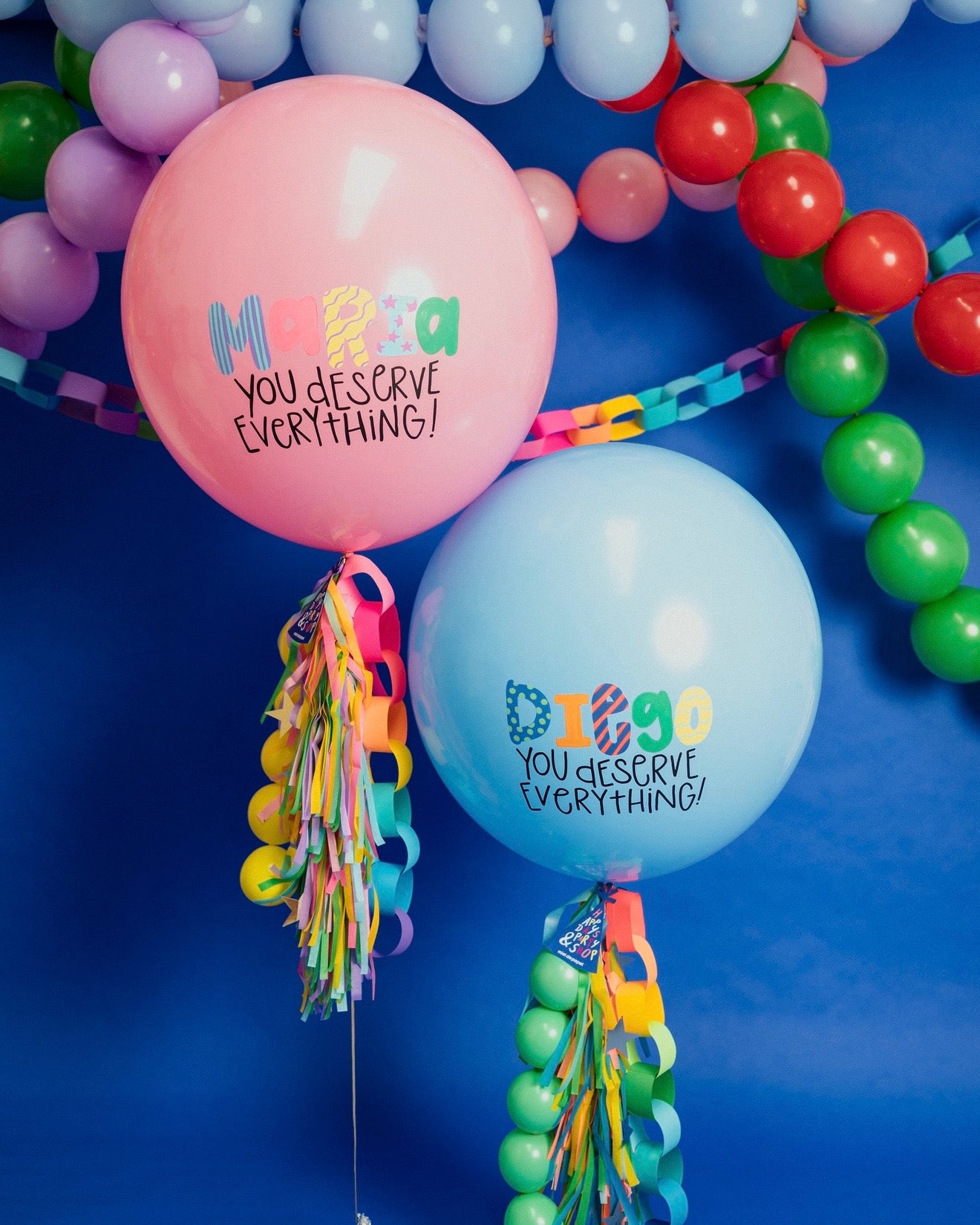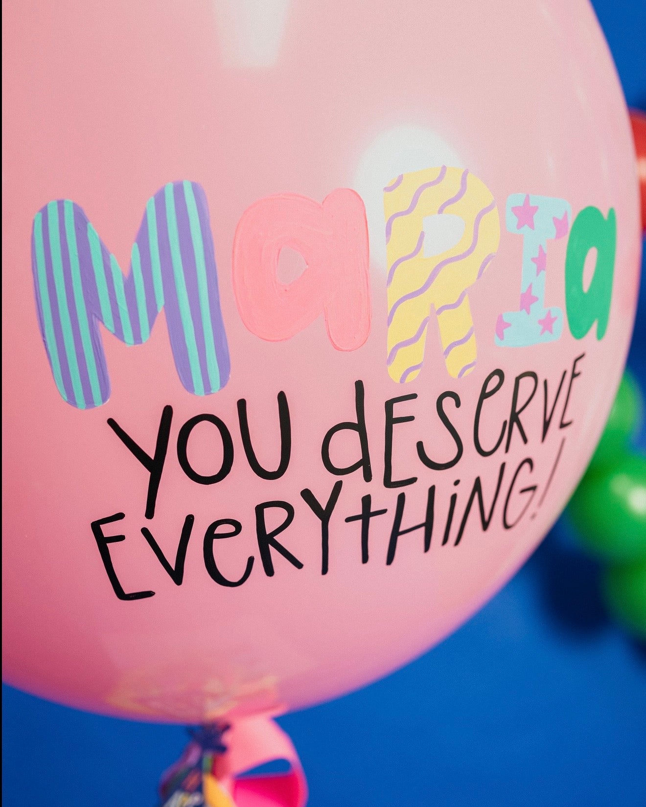 - Gigante de latex de color pastel de 36'' inflado con helio, con el nombre de la niña en tono multicolor con diseños varios y letras negras. Escribir el nombre de la niña en "Indicaciones Especiales". ** El color puede variar debido a la disponibilidad** **La visualización final del producto entregado puede variar en la realidad respecto a esta imagen, ya que el arreglo de globos se elabora a mano.**