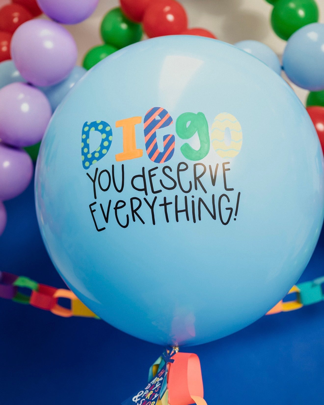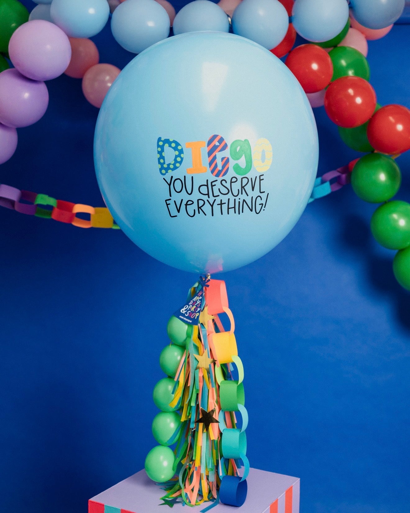 - Gigante de latex de color pastel de 36'' inflado con helio, con el nombre de el niño en tono multicolor con diseños varios y letras negras. Escribir el nombre de el niño en "Indicaciones Especiales". ** El color puede variar debido a la disponibilidad** **La visualización final del producto entregado puede variar en la realidad respecto a esta imagen, ya que el arreglo de globos se elabora a mano.**