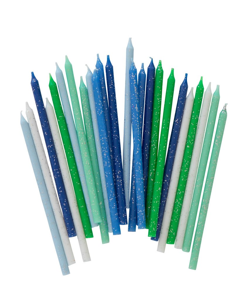 Contiene 24 velas blancas, azules y verdes con brillos plateados