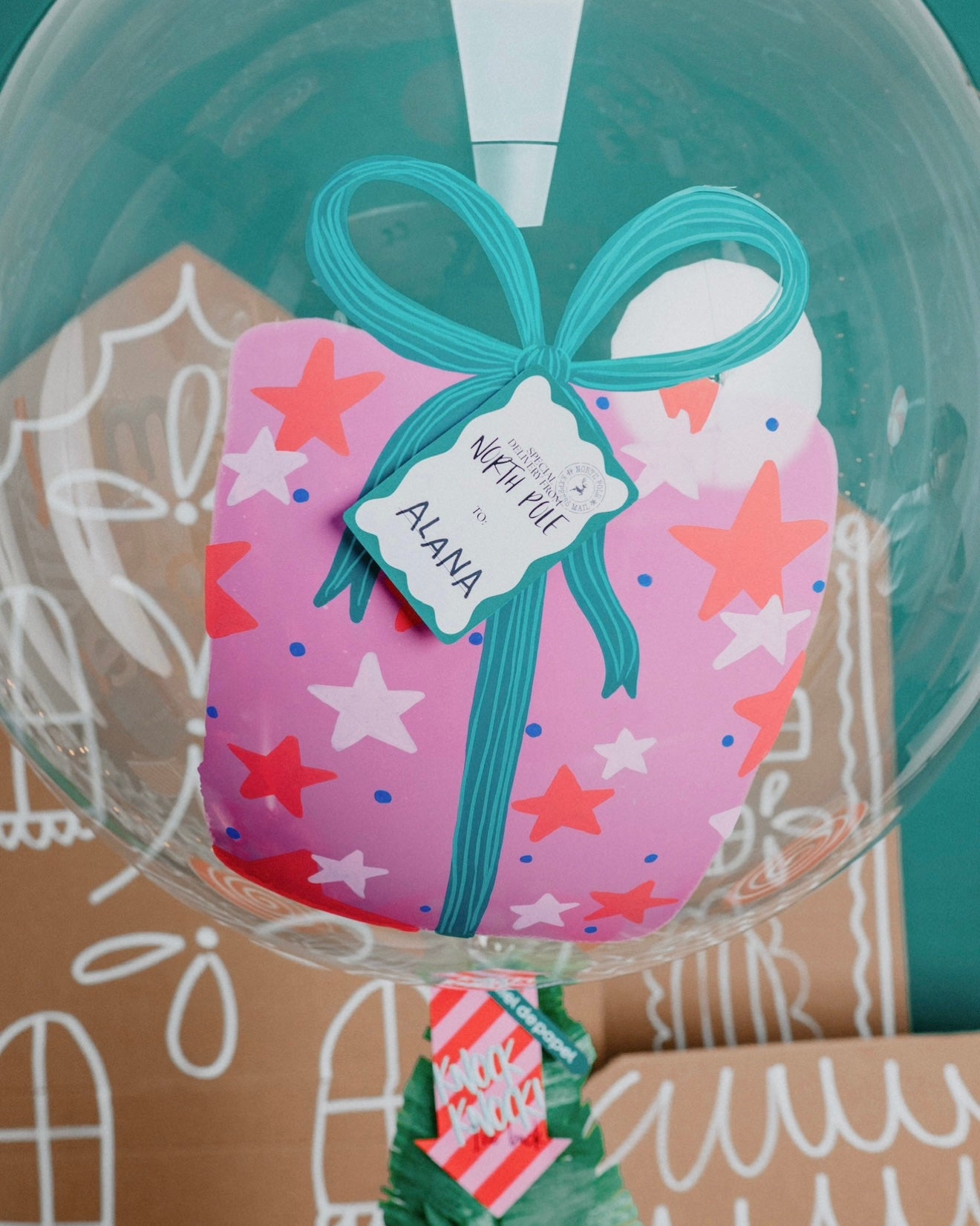 - Burbuja tematica de 24'' pintada con diseño con tematica navideña. Incluye un dibujo de regalo en color rosa y tag tematico con el mensaje "SPECIAL DELIVERY FROM THE NORTH POLE TO:" donde se agregara el nombre indicado. Agregar el nombre en "INDICACIONES ESPECIALES". También incluye tassels decorativos. **La visualización final del producto entregado puede variar en la realidad respecto a esta imagen, ya que el arreglo de globos se elabora a mano.**