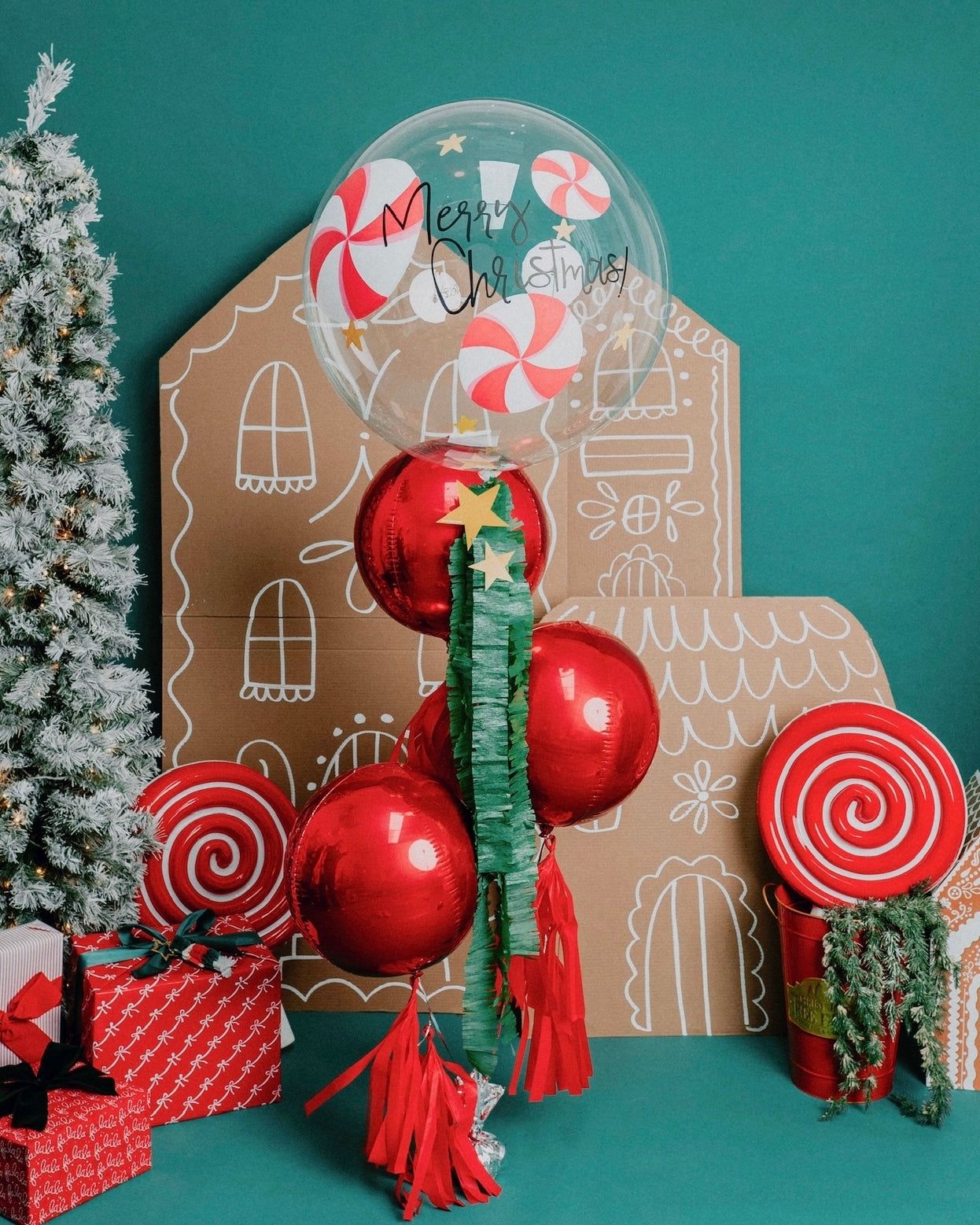 - Burbuja tematica de 24'' pintada con diseño con tematica navideña. Incluye un dibujo de candy canes redondos y el mensaje "MERRY CHRISTMAS". También incluye tassels decorativos. **La visualización final del producto entregado puede variar en la realidad respecto a esta imagen, ya que el arreglo de globos se elabora a mano.**